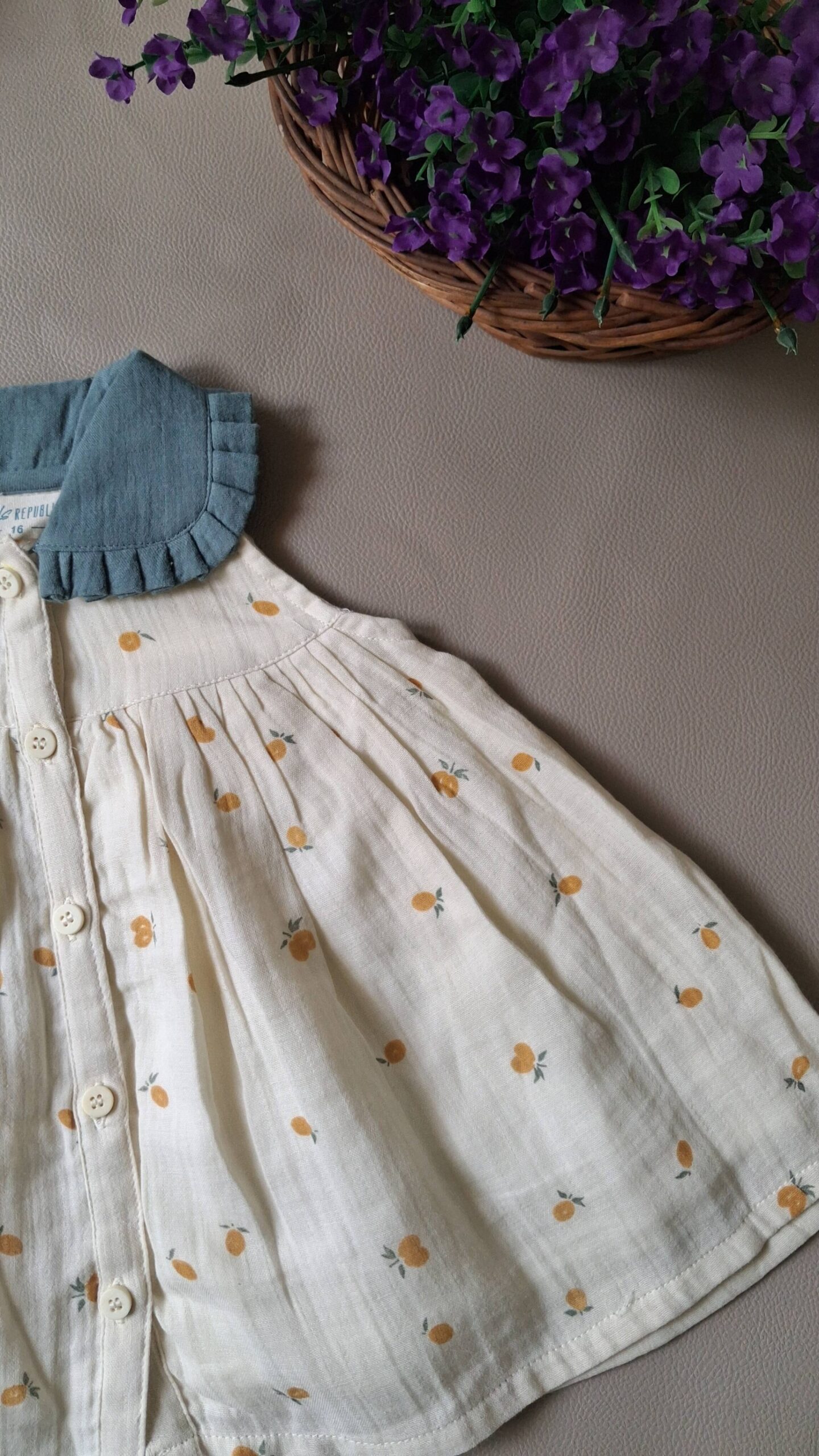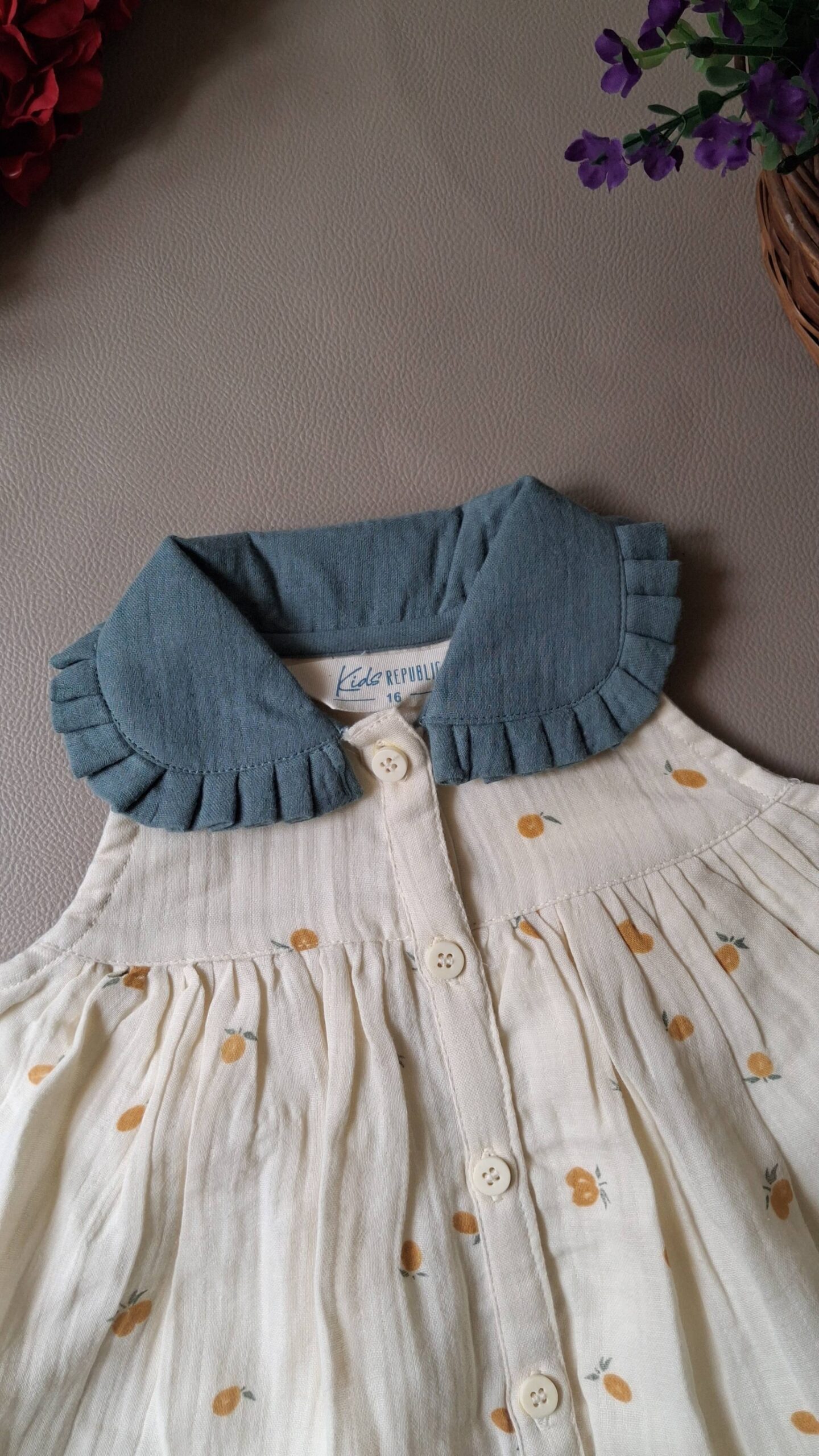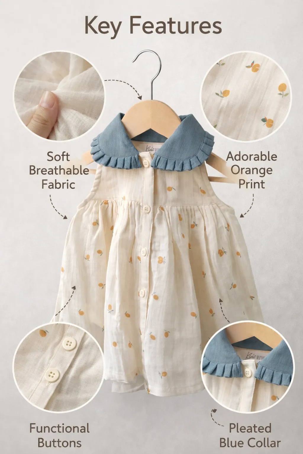 Soft muslin baby girl dress with floral print, ruffle collar, and front button closure.