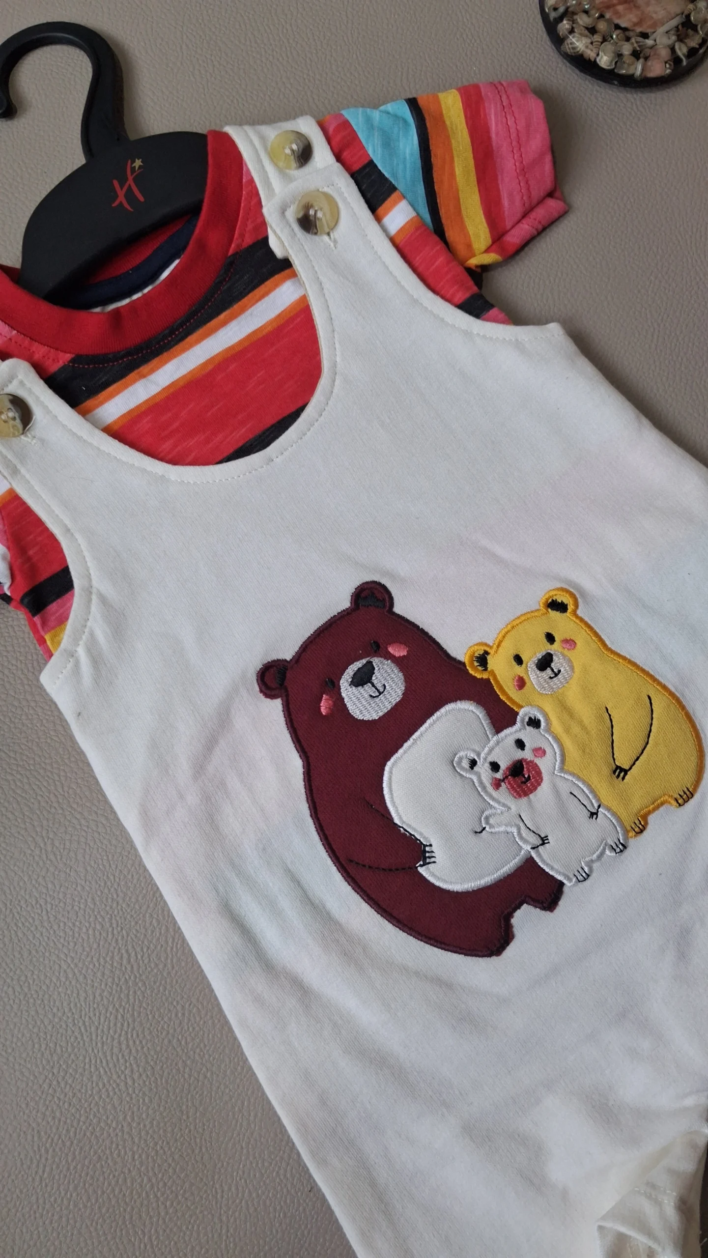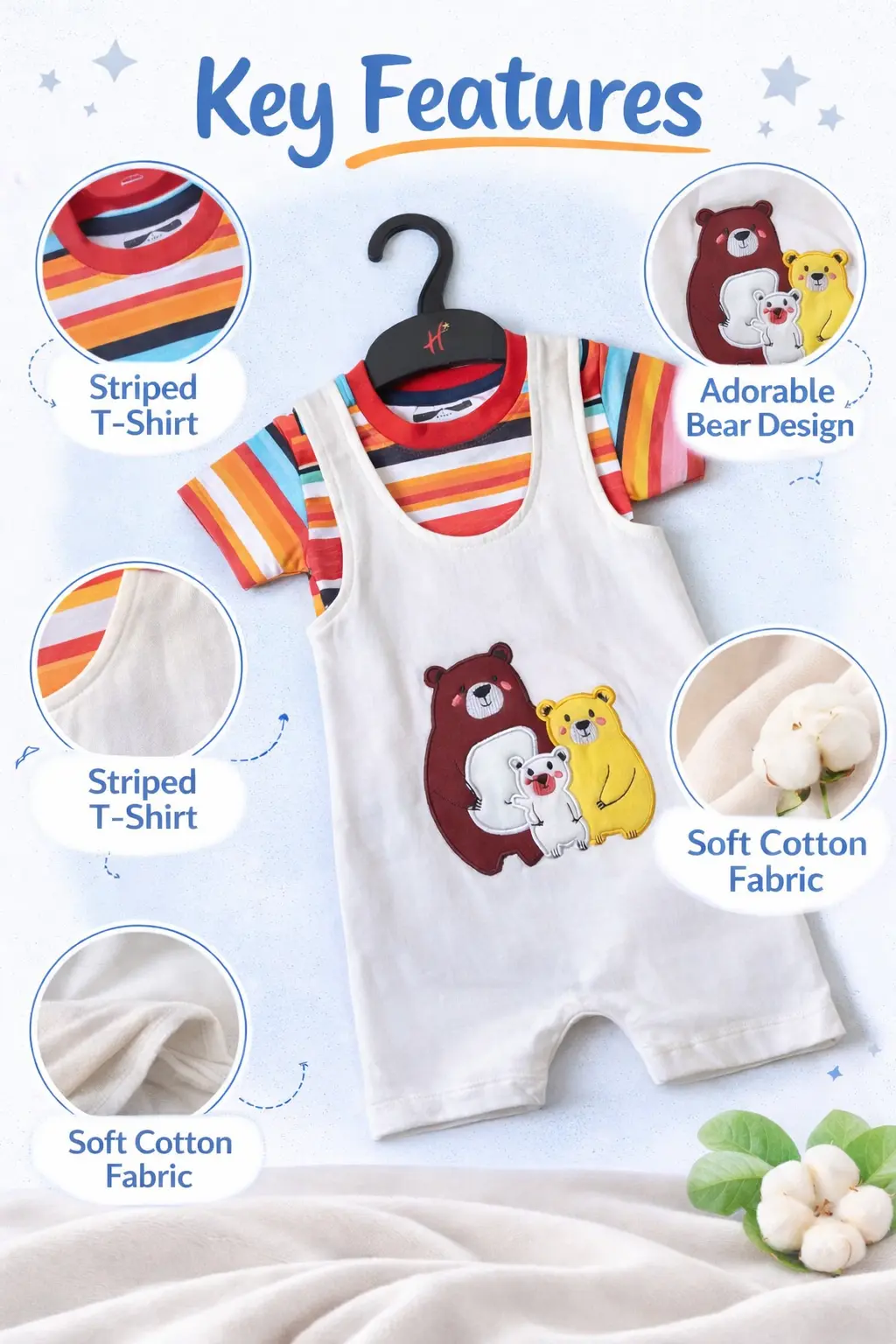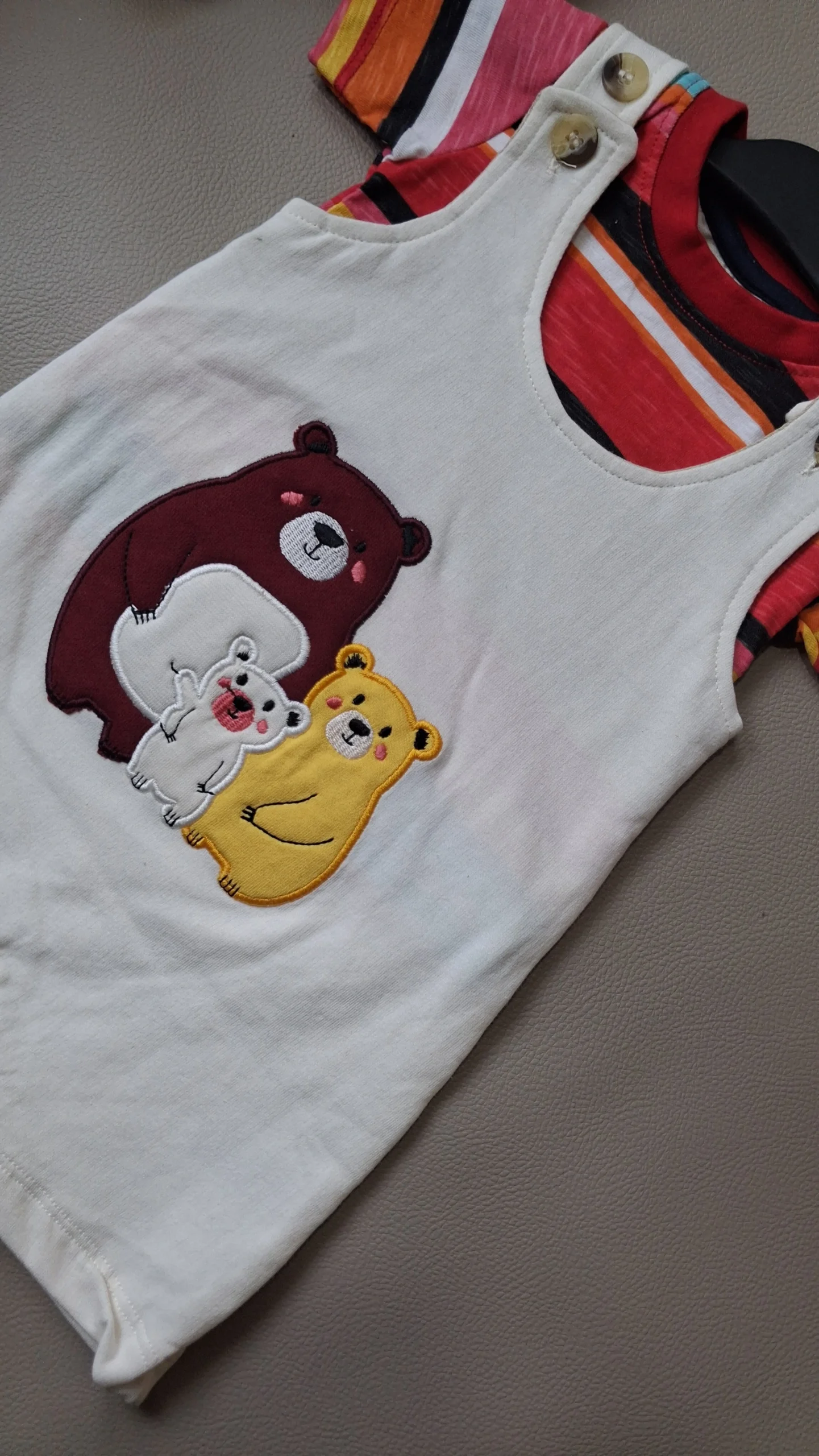 An adorable 2-piece baby outfit featuring a colorful striped tee paired with a soft white dungaree showcasing cute bear embroidery, perfect for playful days and sweet photo moments.