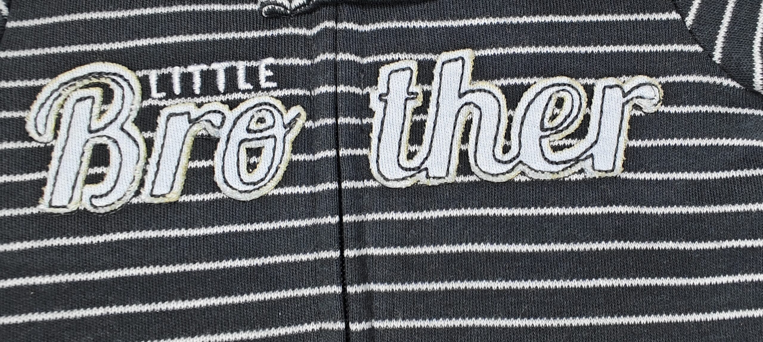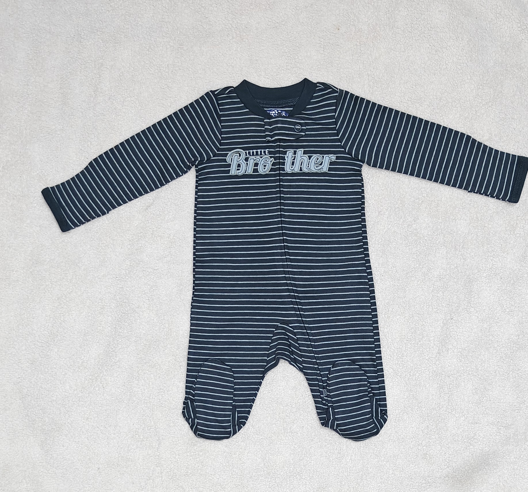 A cozy, striped cotton footie featuring a “Little Brother” graphic and a convenient 2-way zipper for easy changes.
