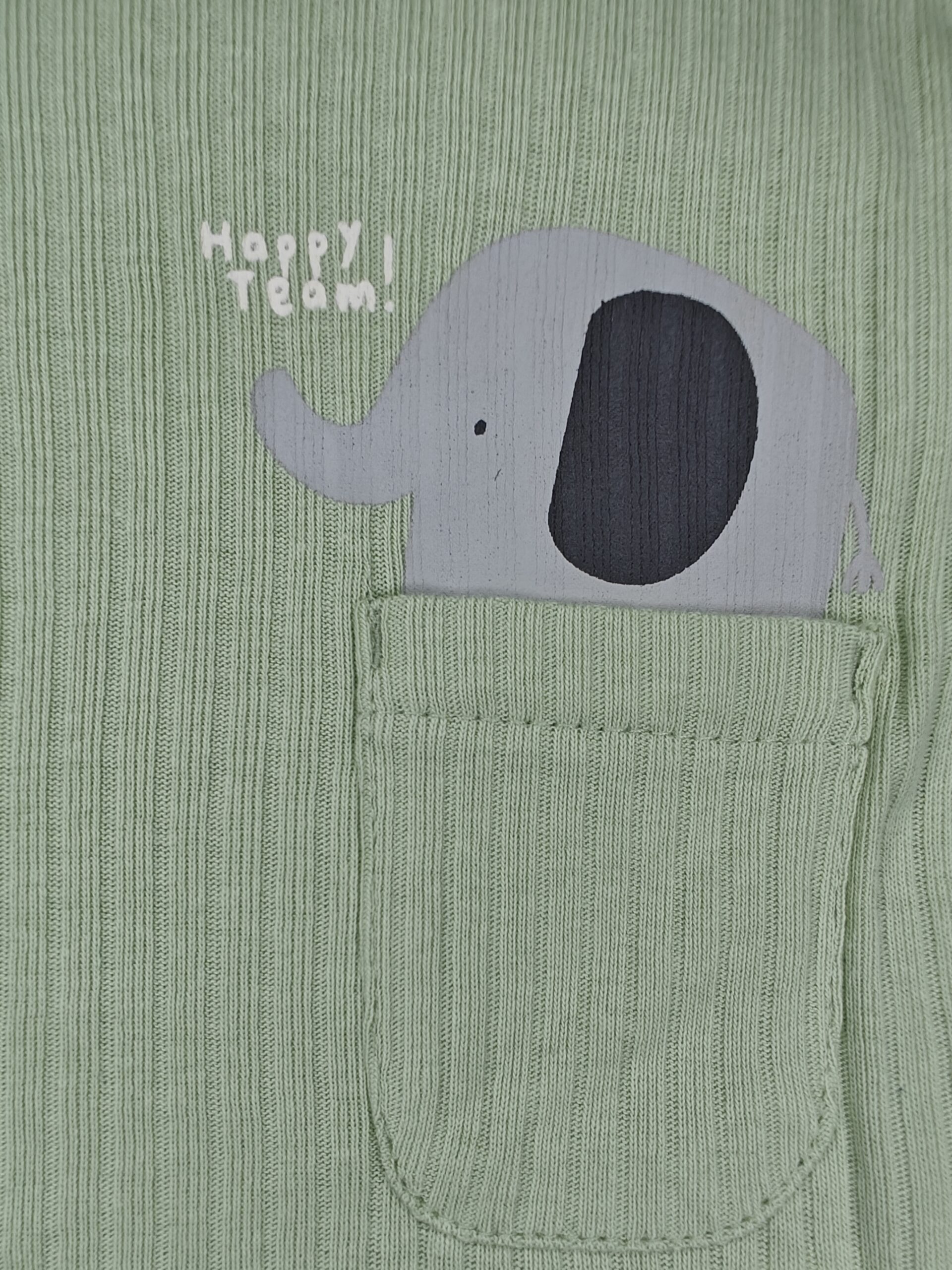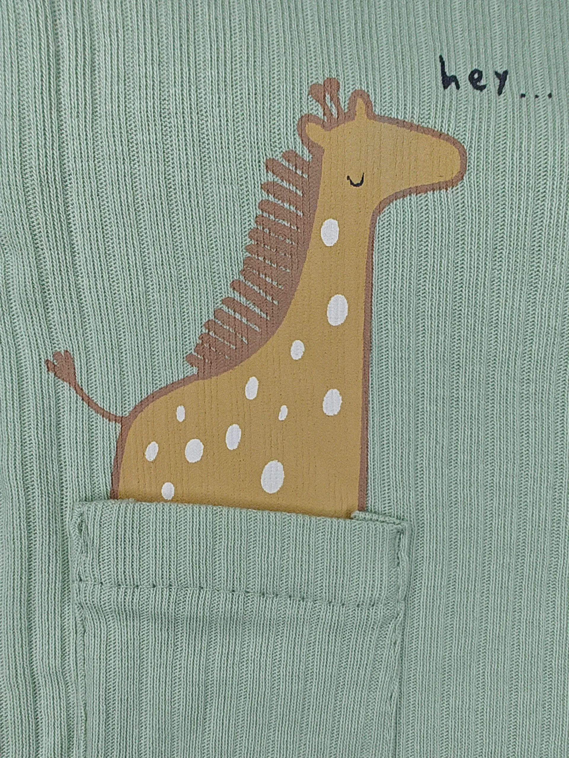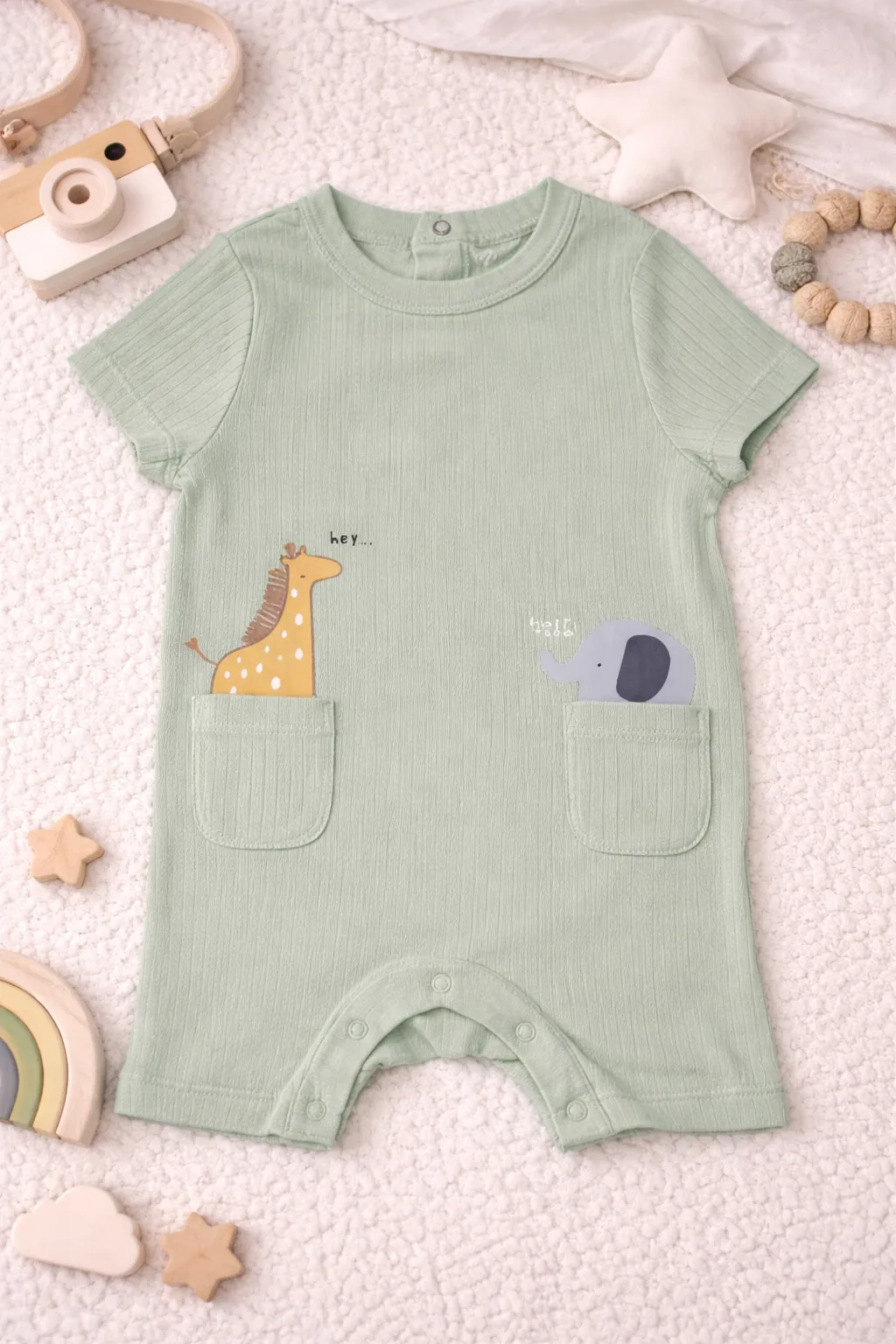 An adorable, sage green ribbed romper featuring cute safari animal pocket graphics and easy-snap buttons for all-day comfort and play.
