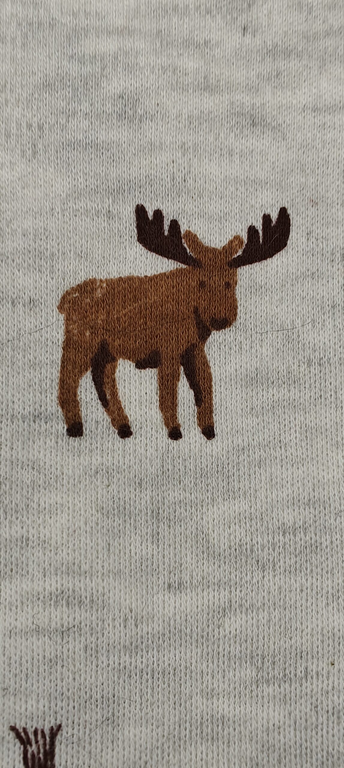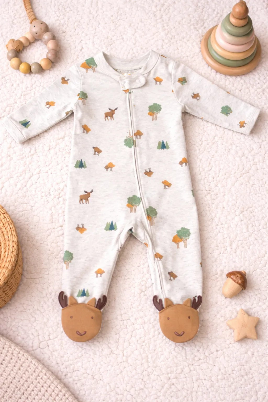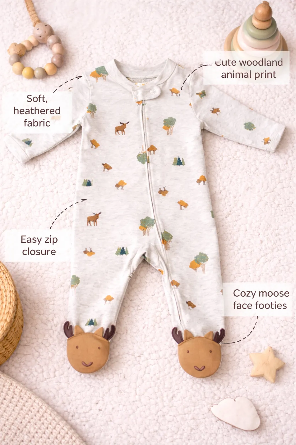 Whimsical 3D Detail: Adorable moose face appliqués with soft antlers on the feet.