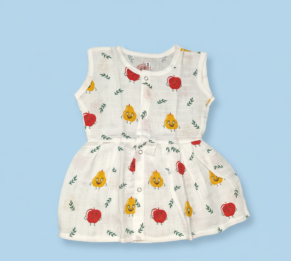 Unisex muslin cloth with pear and apple patternMuslin “Front Button” Frock with Pear & Apple Pattern