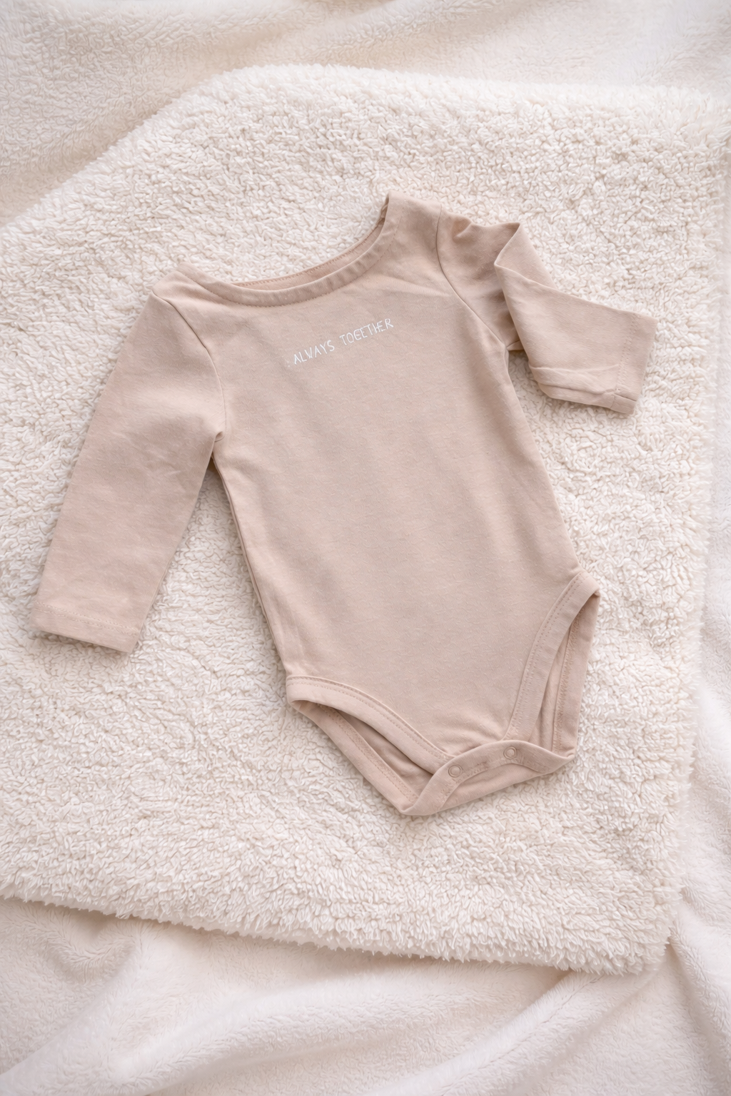 Soft ribbed cotton baby onesie in a neutral beige shade, designed for all-day comfort and easy diaper changes.