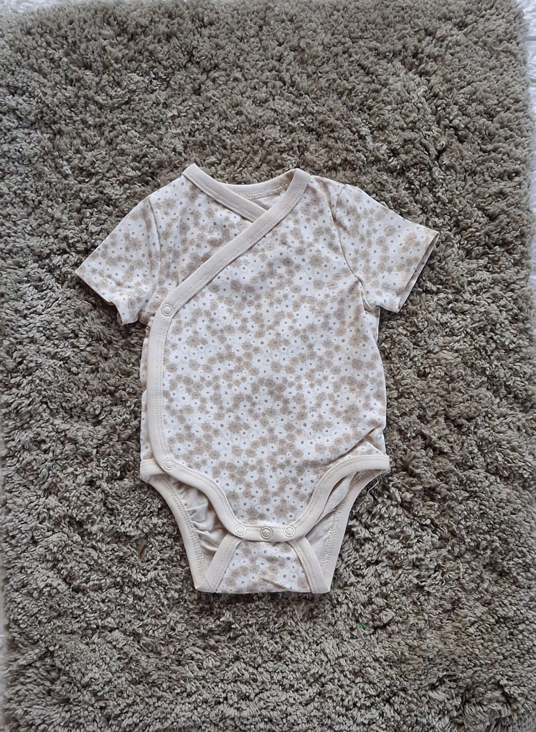 Soft, breathable wrap-style baby onesie with a subtle floral print and easy snap closure.
