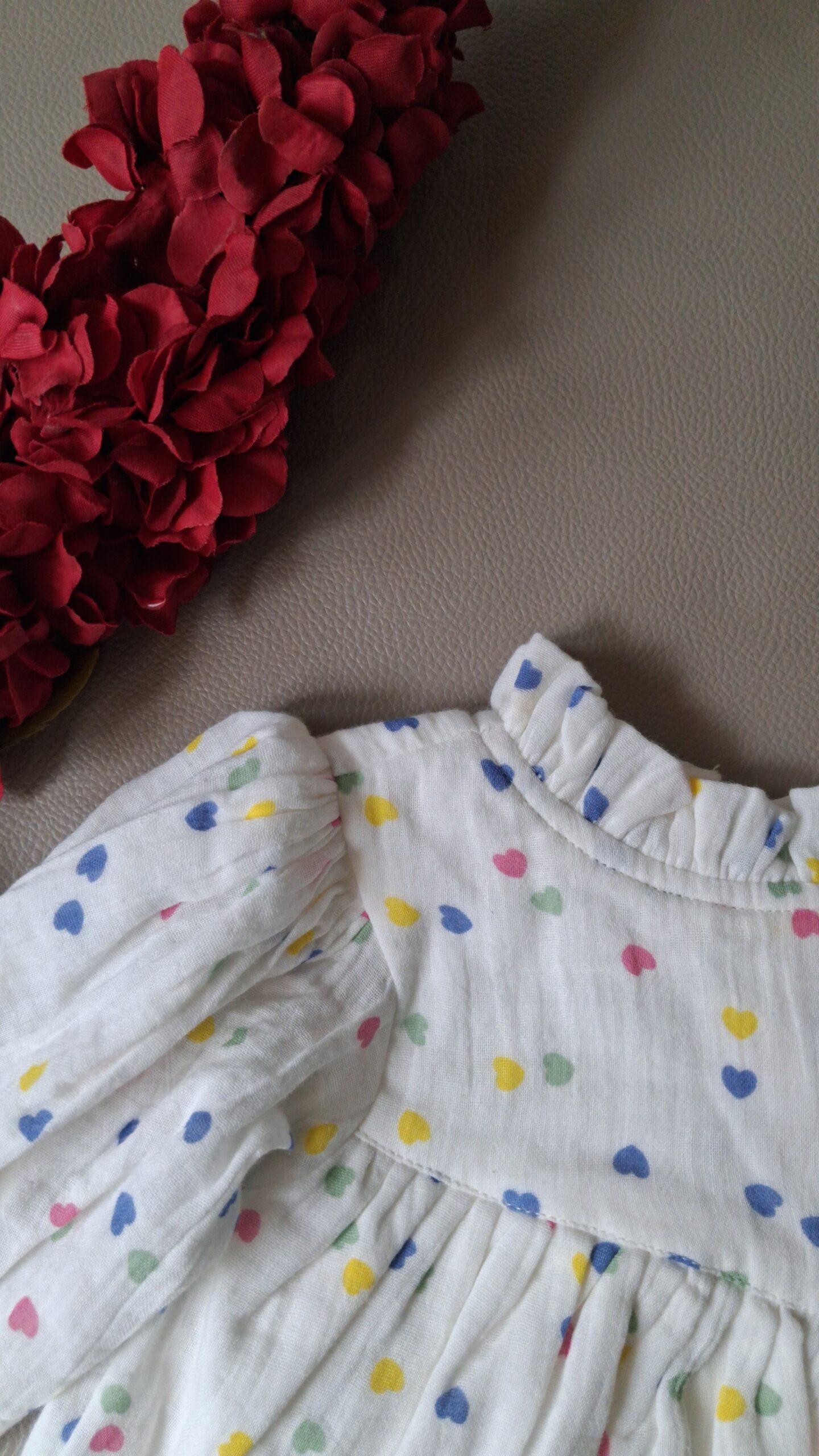 Soft muslin baby dress with multicolor heart print, ruffled neckline, and long sleeves for a charming everyday look.