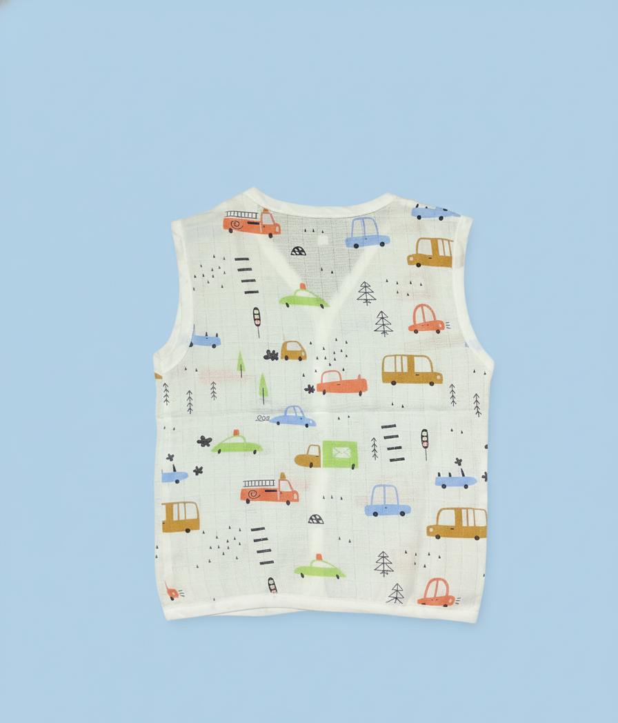 Unisex muslin cloth with car and truck patternUnisex Muslin Button Jabla with Car & Truck Pattern
